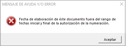 Importante: cuando seleccionas el tipo de documento y si la resolución no se ha actualizado, te muestra el mensaje que la fecha está fuera del rango de la numeración autorizada y no te deja continuar: