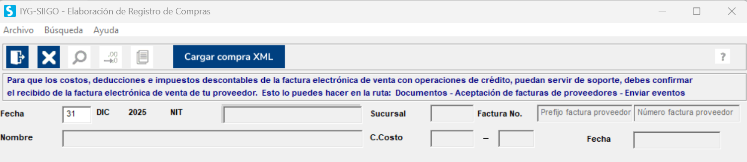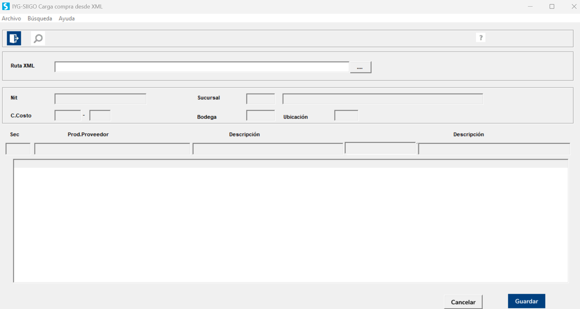 Al dar clic, de allí te ingresará a una nueva ventana donde vas a poder llamar el documento XML del documento enviado por tu proveedor, del que vas a generar la factura de compra, colocas la ruta donde guardaste el archivo XML y digitas los datos que te solicita del proveedor y el sistema de forma automática te traerá los productos de esa factura.