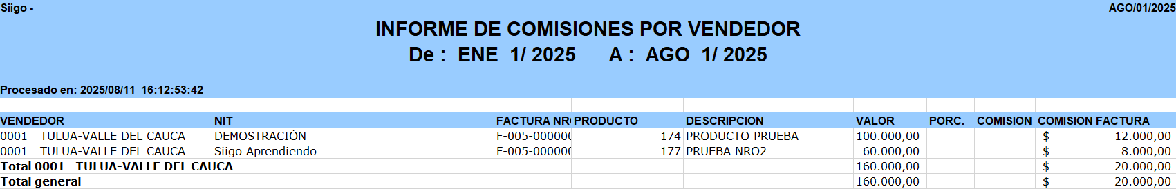 - Detallada: al seleccionar este campo, la información de las comisiones discrimina documento por documento (detallando cada uno de las facturas de venta).